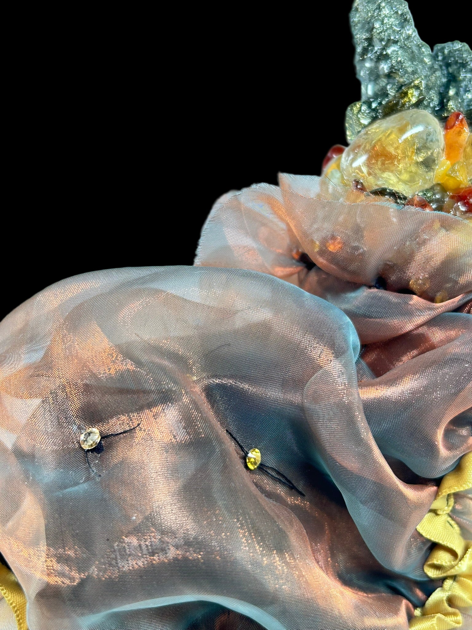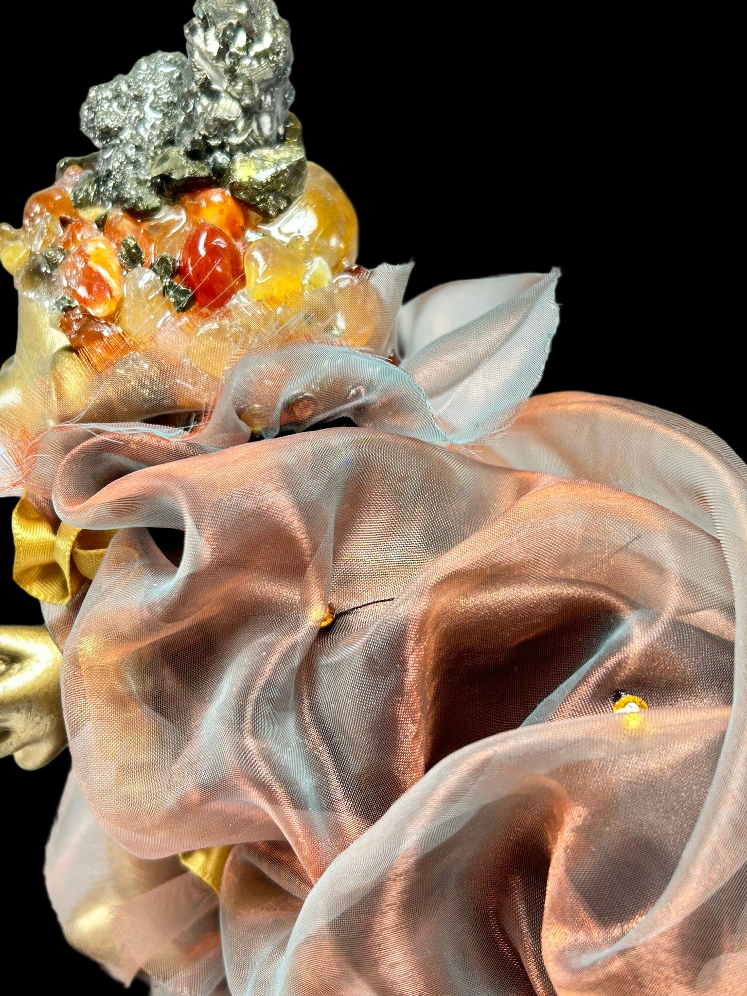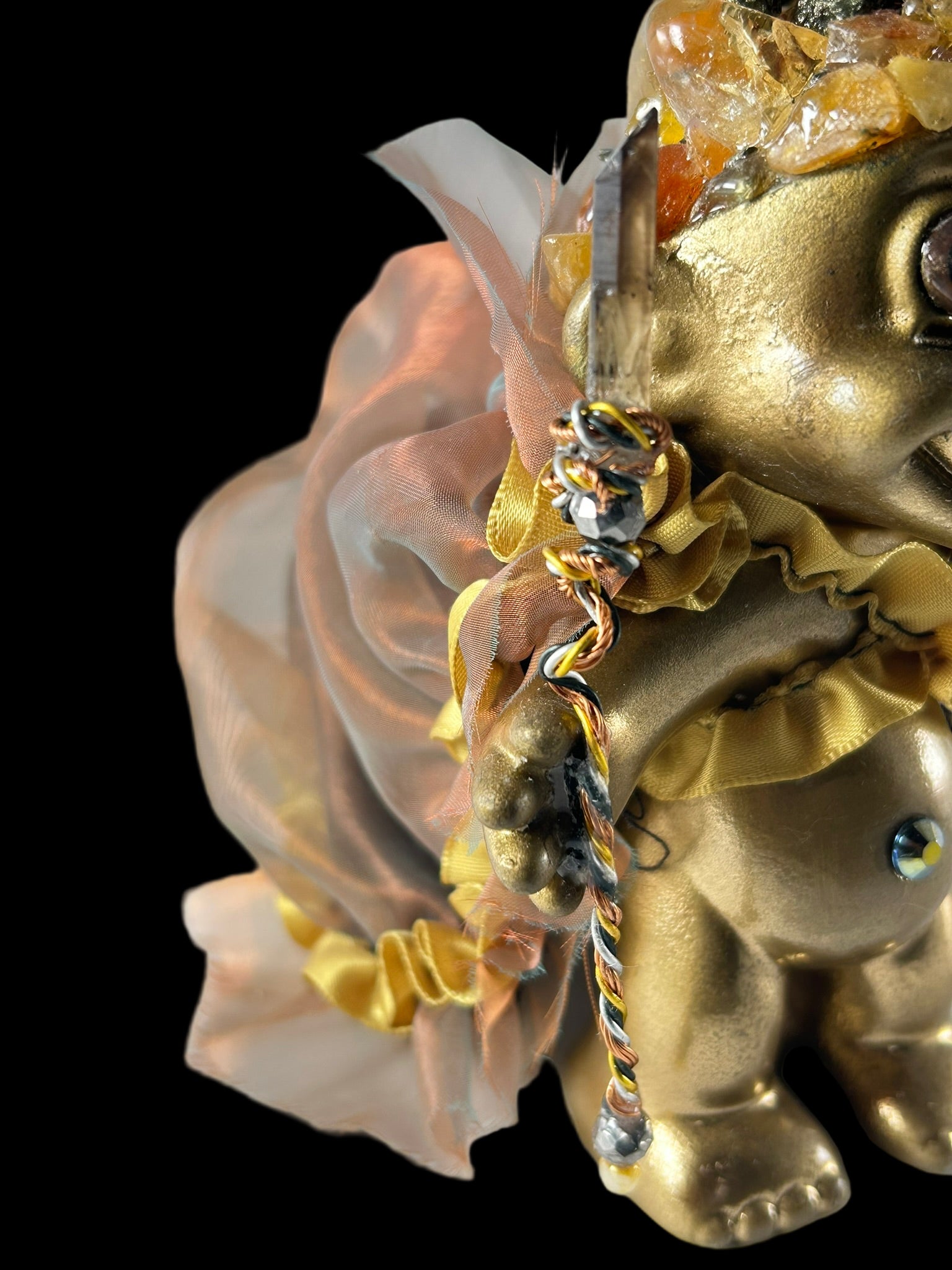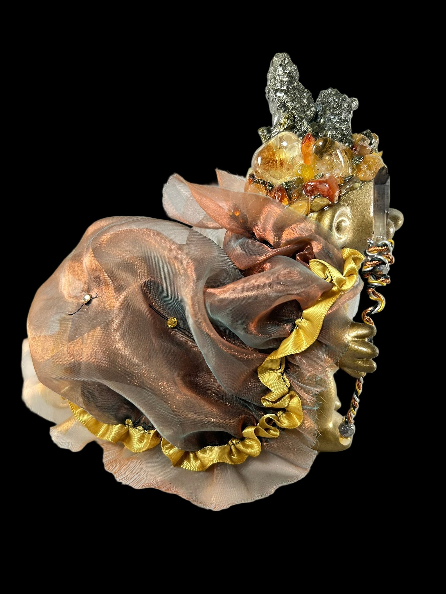 With its rich gold covering and shimmering puffy clock, this Troll has been created with the set intention to bring peace, luck, and happiness to the person who connects with this Troll. The headress contains Pyrite, smoky quartz and Carnelian.
