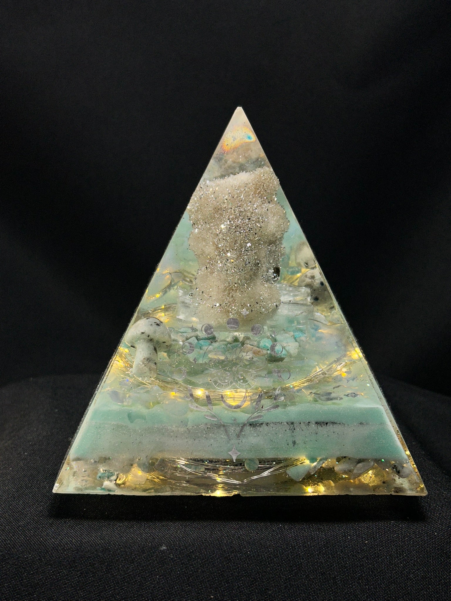 This Spirit Quartz Orgonite Pyramid Lamp merges ancient crystal wisdom with modern energy-balancing technology. The orgonite matrix—crafted from resin and metallic elements—works synergistically with Spirit Quartz to promote energetic coherence and emotional equilibrium. The pyramid geometry amplifies vibrational frequencies, while the integrated lamp provides gentle illumination for meditation and mindfulness practices. Ideal for practitioners seeking to elevate their wellness space with a piece that bridges traditional crystal healing and contemporary orgone research. A sophisticated addition to any sanctuary or therapeutic environment.